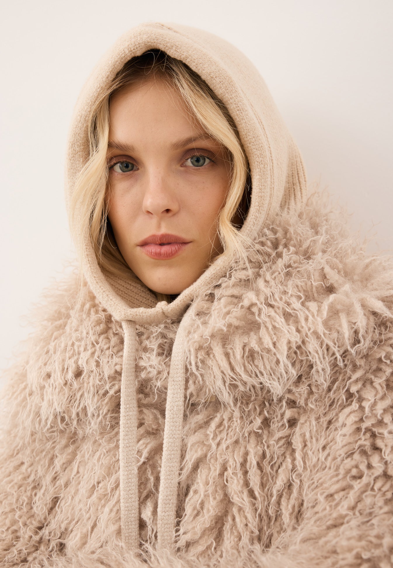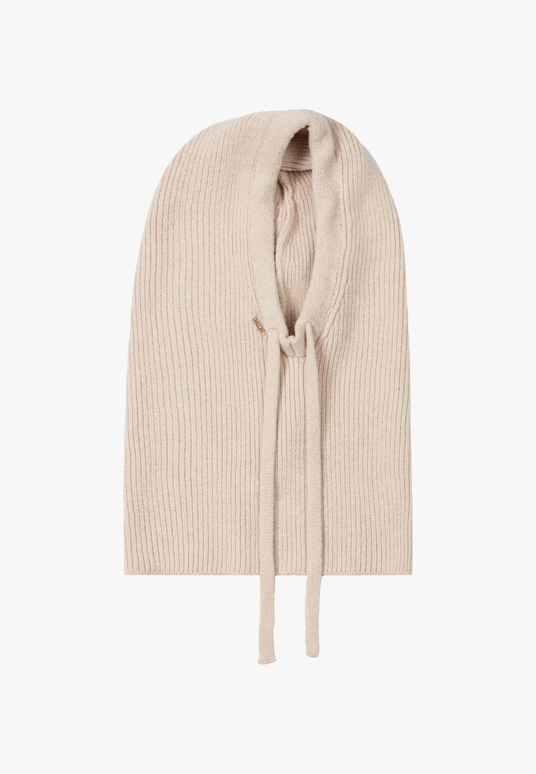 The beige BALA balaclava is designed with adjustable drawstrings that allow for a customized fit, ensuring comfort during wear. Its neck-covering length provides an extra layer of insulation against cold temperatures. Decorated with golden BIZUU logo letters, it adds a subtle yet striking accent to the sleek black design. Perfect for colder days, it offers both warmth and a stylish look.