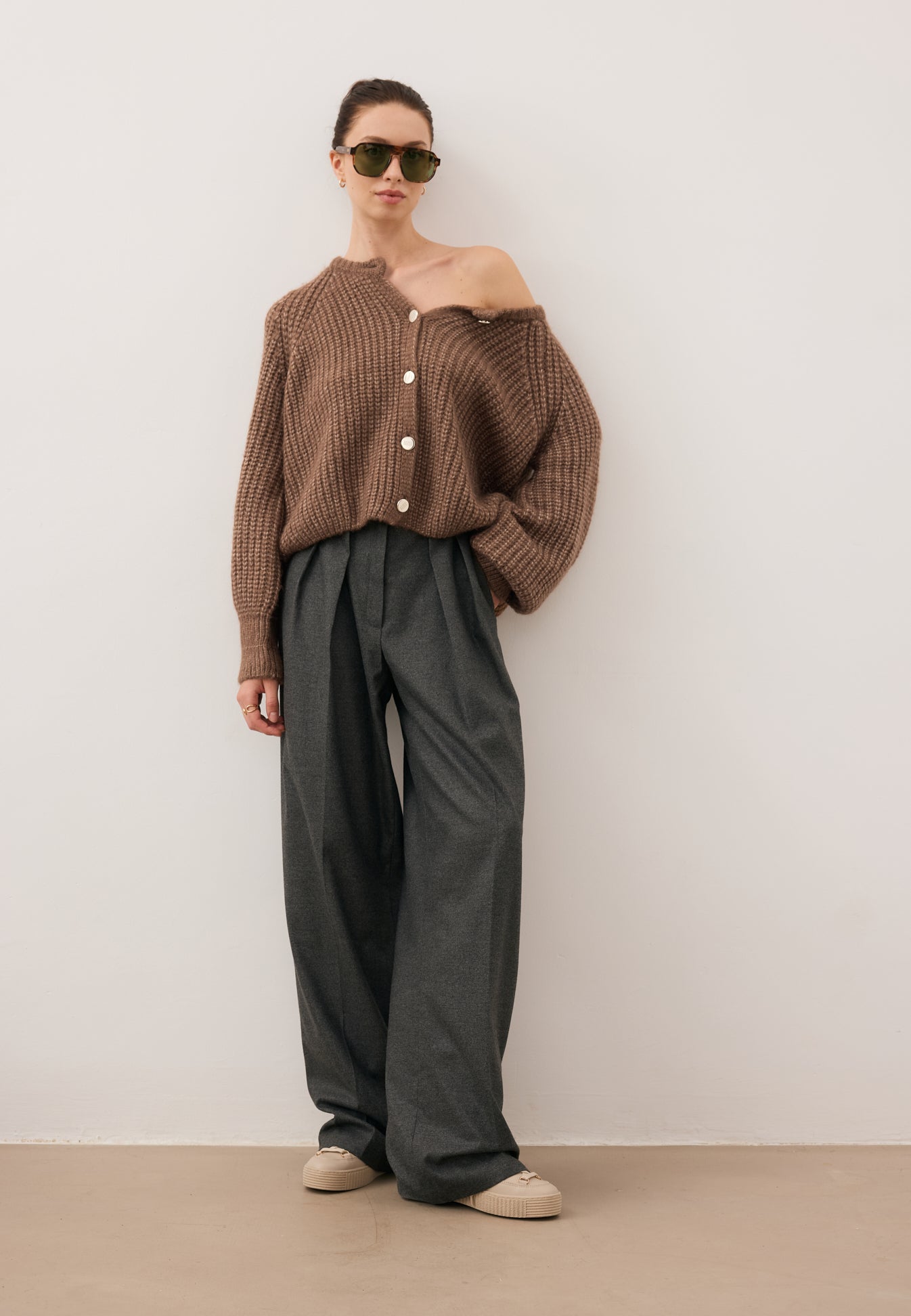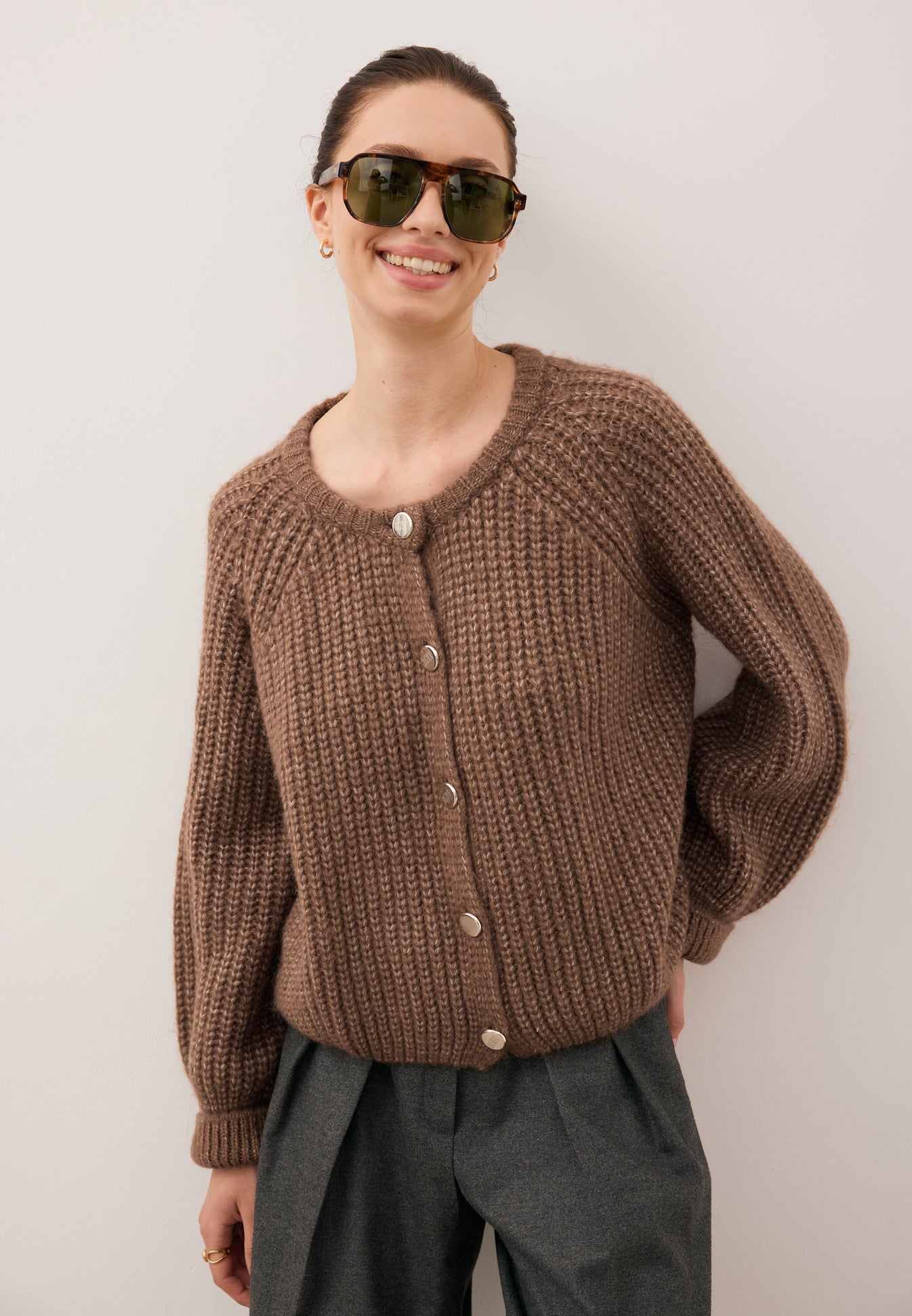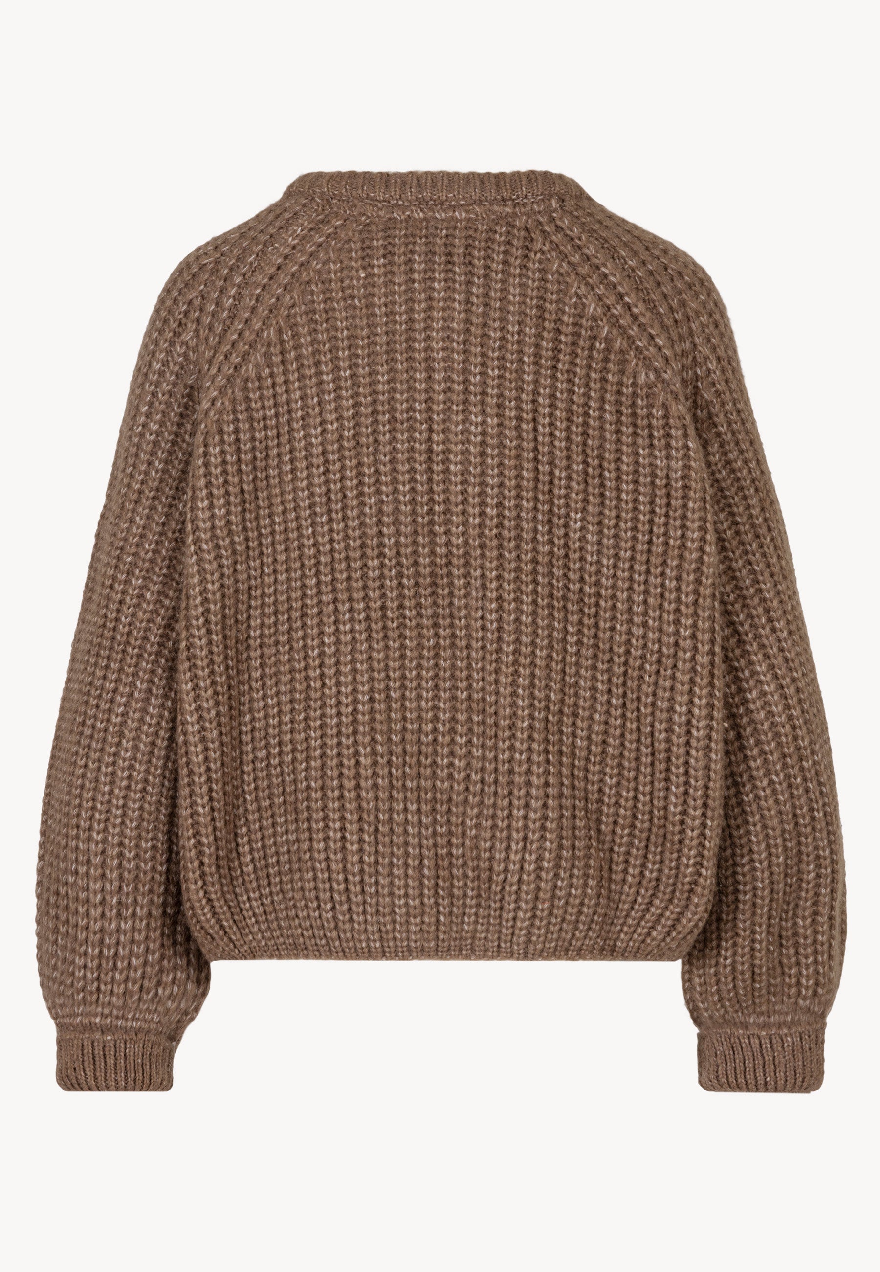 The ORNAMY sweater combines classic style with modern design. Featuring branded button fastening, it serves as an elegant wardrobe piece perfect for everyday wear or smart-casual looks. The long raglan sleeves ensure freedom of movement, while the turned-up cuffs add a subtle, refined touch. The brown mélange yarn is soft, warm, and pleasant to the touch, with its quality confirmed by the OEKO-TEX certification, guaranteeing safety and high production standards.