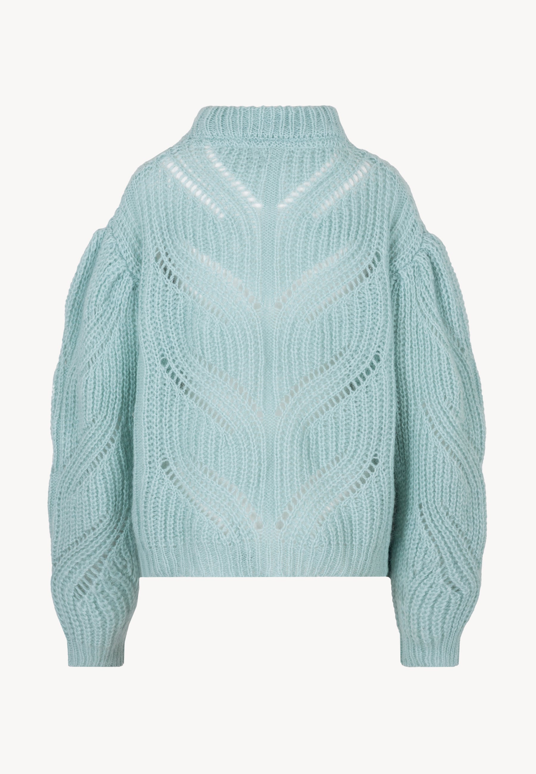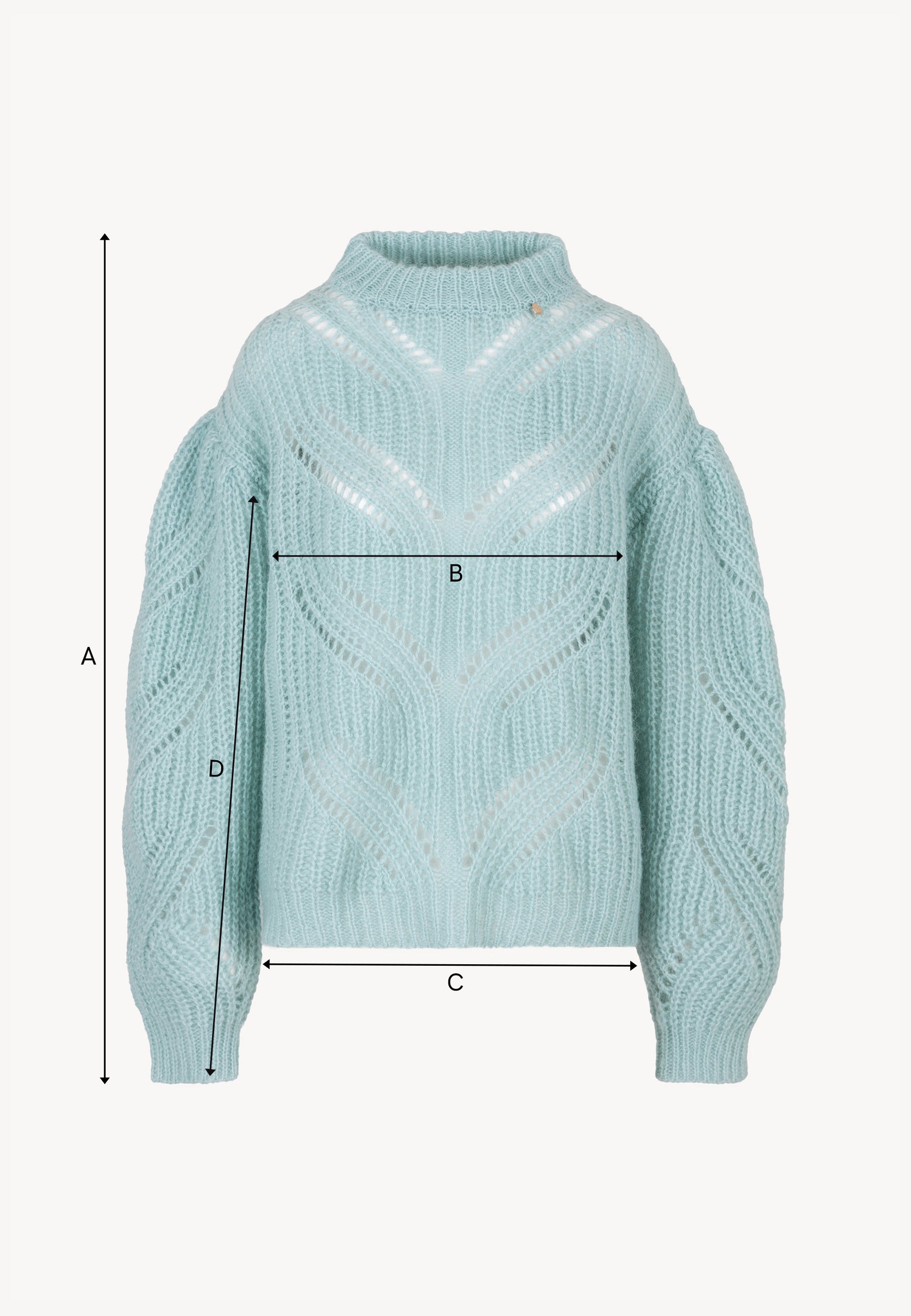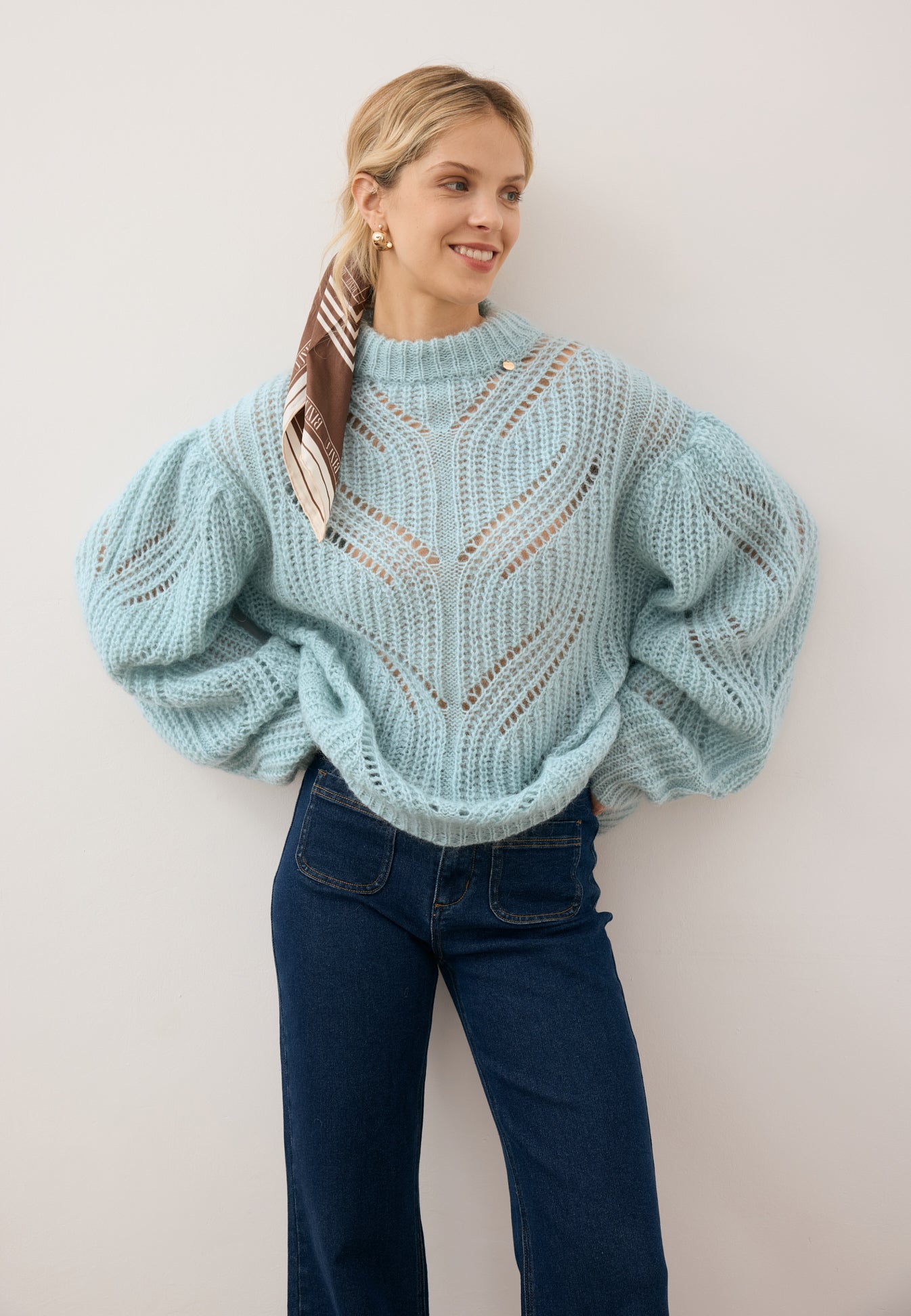 This women's jumper in blue is a very comfortable and versatile model to have in your wardrobe. Thanks to its unique features, such as openwork weave, comfortable way of putting it on and spacious sleeves, it will meet the expectations of even the most demanding customers. It is ideal for both those who appreciate comfort and expressing individual style.