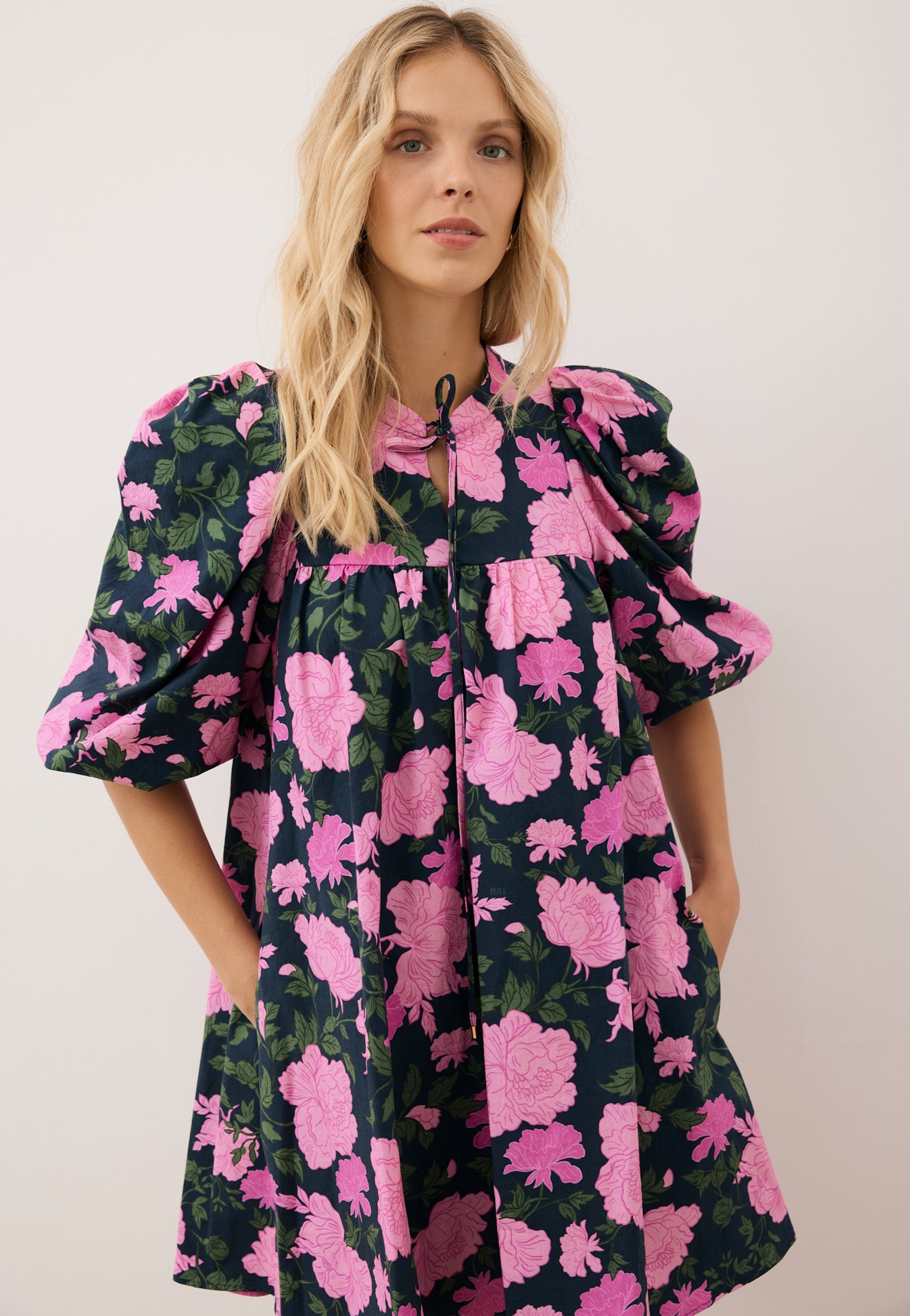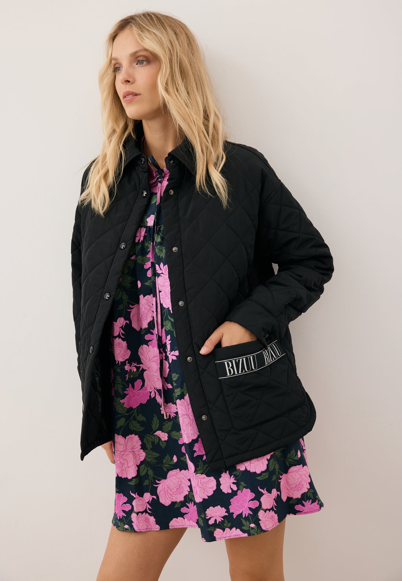 The AYOTE dress is the essence of elegance and style. Its mini length and original floral print on a navy blue background make this dress sure to turn heads. The puffed sleeves add lightness and originality, while the decorative drawstring closure with gold-plated ends gives the whole piece a unique character. There is also a decorative medallion with the BIZUU logo. The perfect choice for women who appreciate sophisticated style and the highest quality.