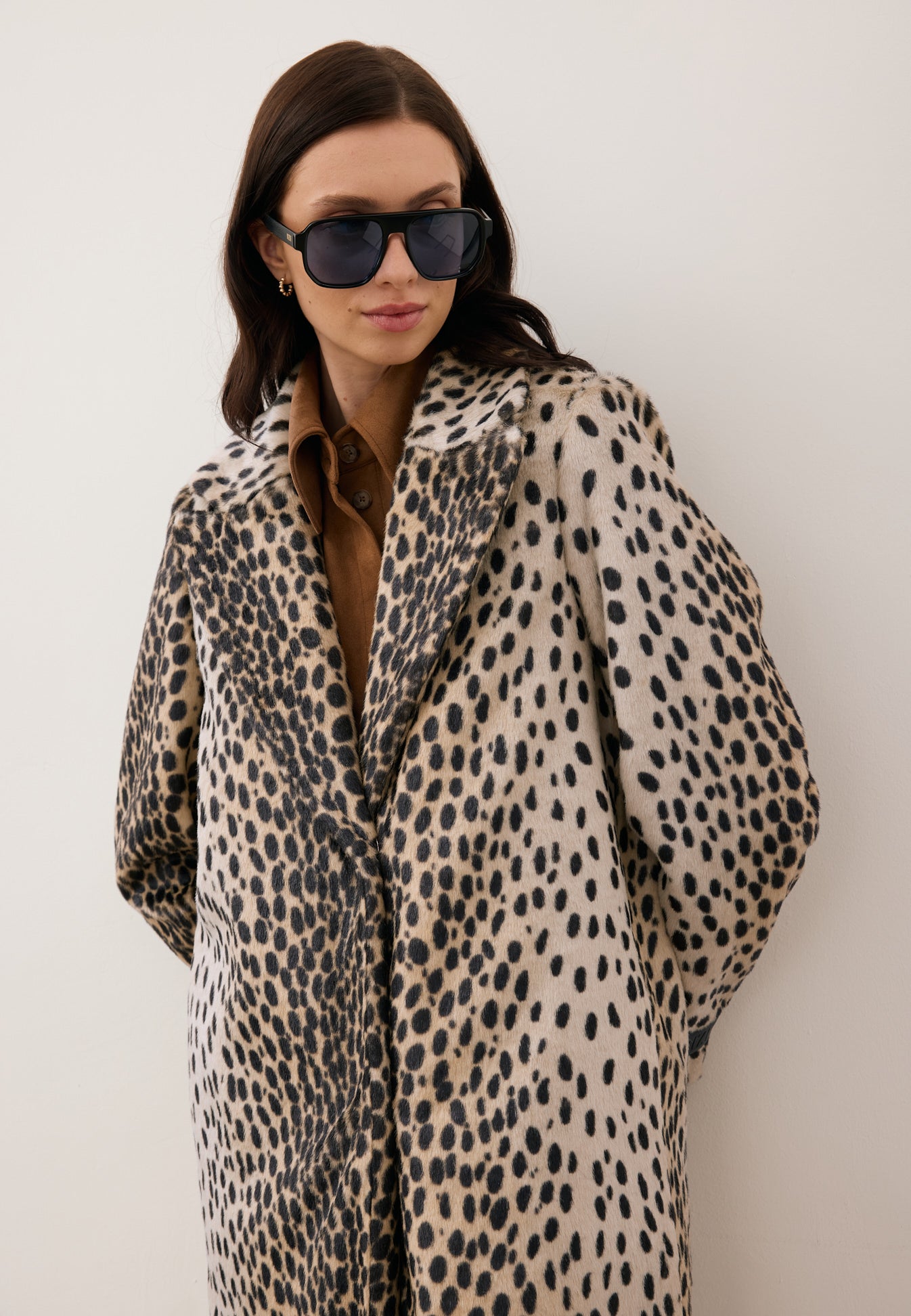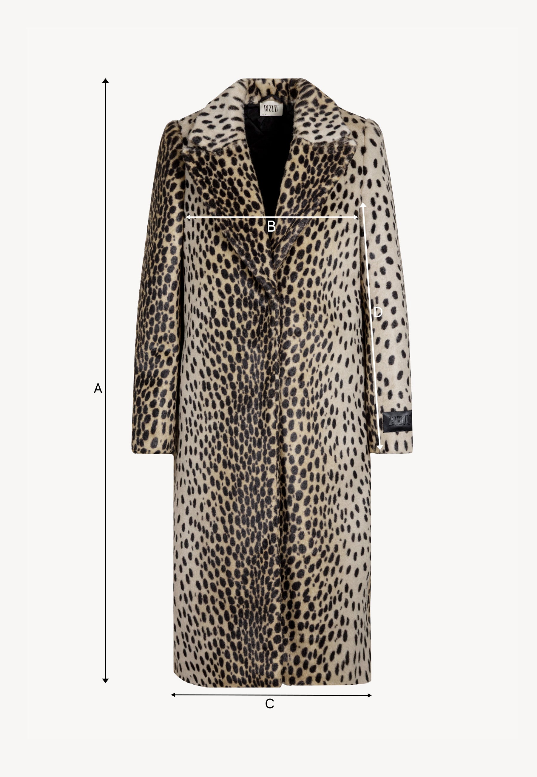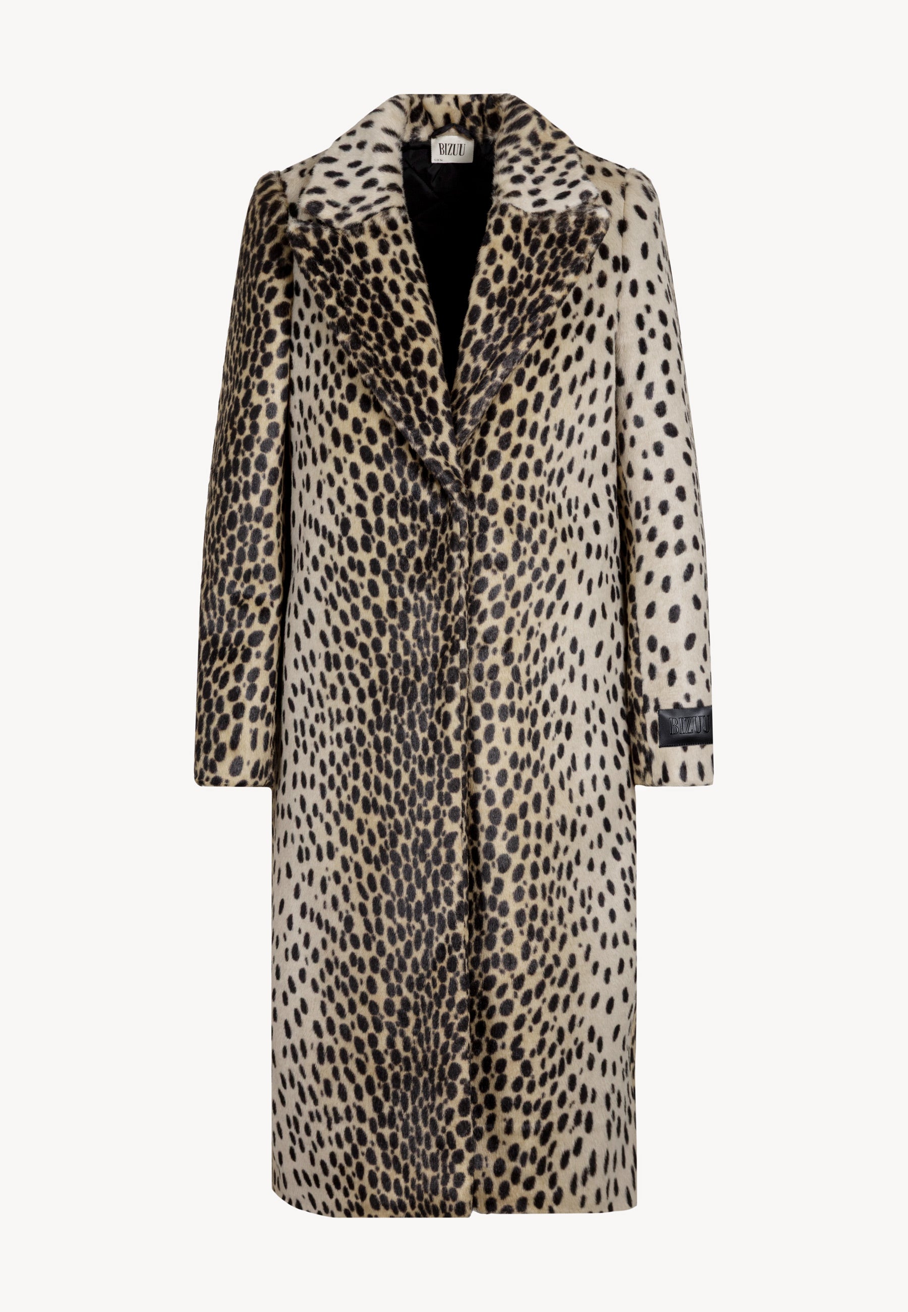 PONTICELLI coat is an elegant, long faux fur piece featuring a short-pile animal print. Single-breasted and fastened with snap buttons, it includes a quilted lining with insulation in the upper section for added warmth. The design is completed with a notched collar, side pockets, and a debossed BIZUU logo label.