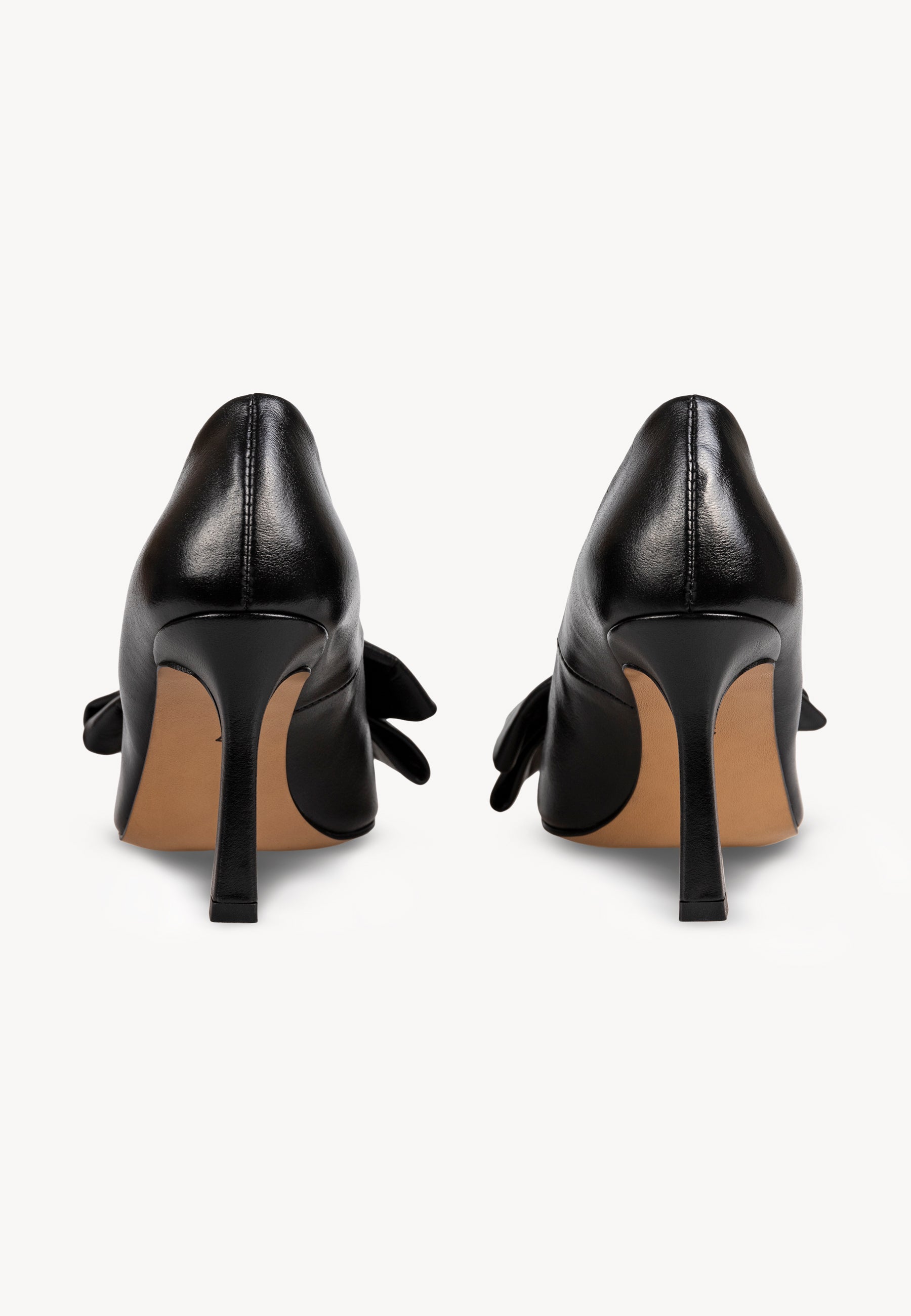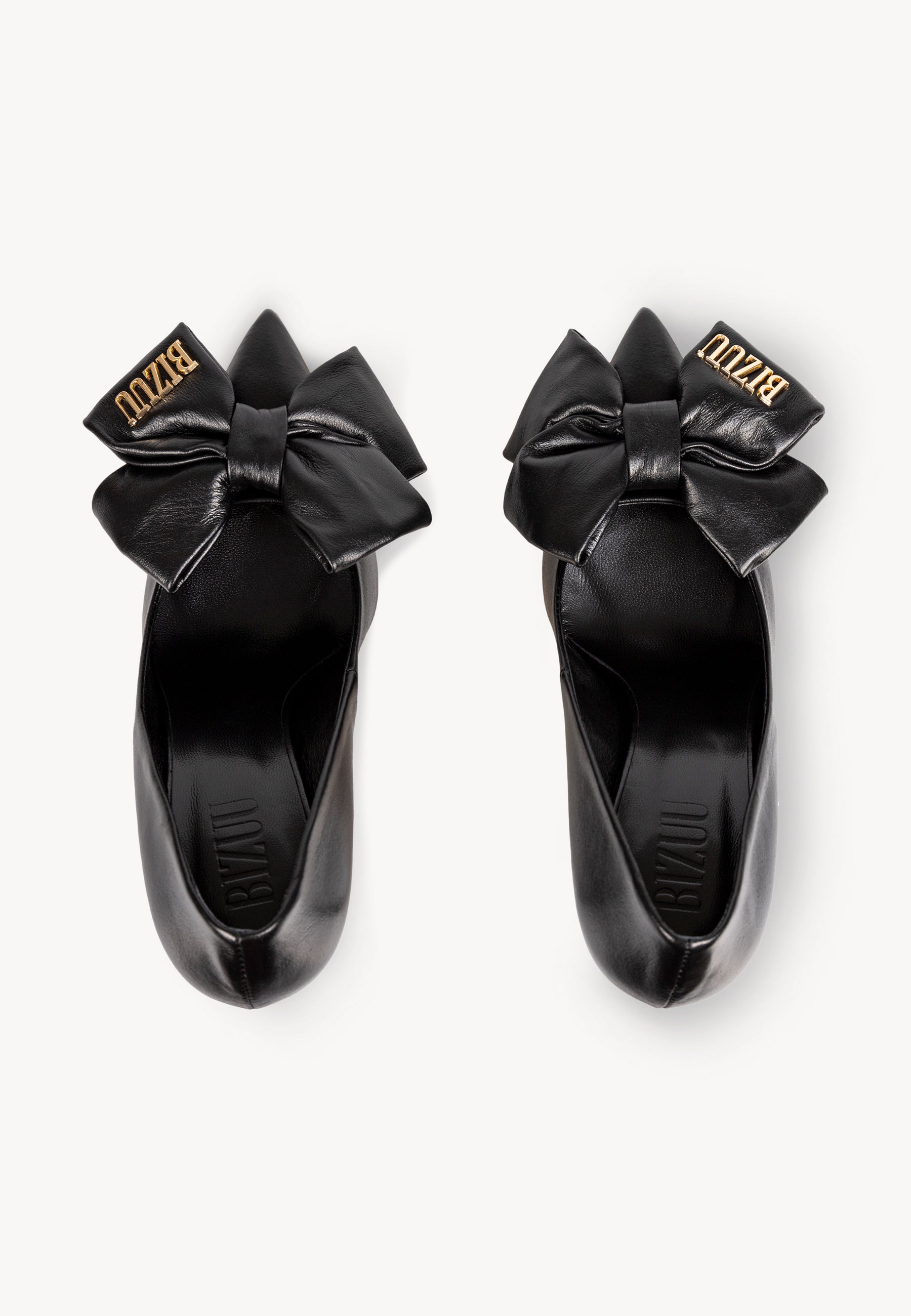 The VALERIA pumps embody the essence of feminine elegance. Crafted from soft, natural leather, they ensure durability, comfort, and a perfect fit. Their classic silhouette is enhanced by a striking detail — a decorative bow on the front adorned with golden BIZUU lettering. VALERIA is a model that beautifully combines fashion and comfort, making it perfect for both elegant and everyday outfits.
