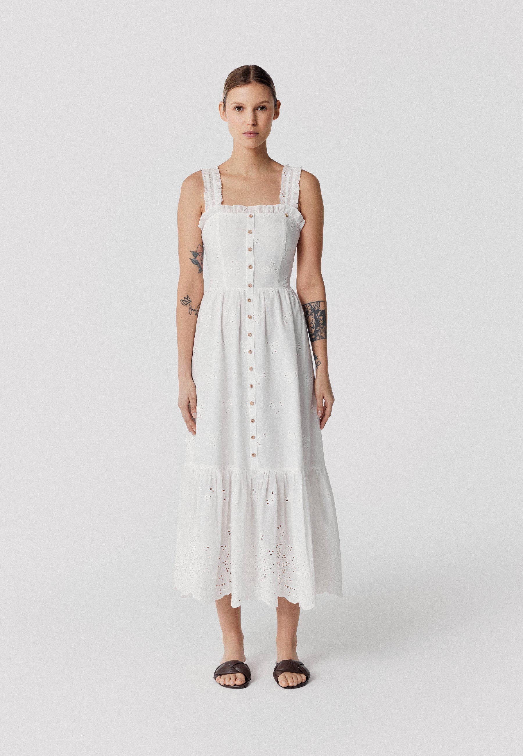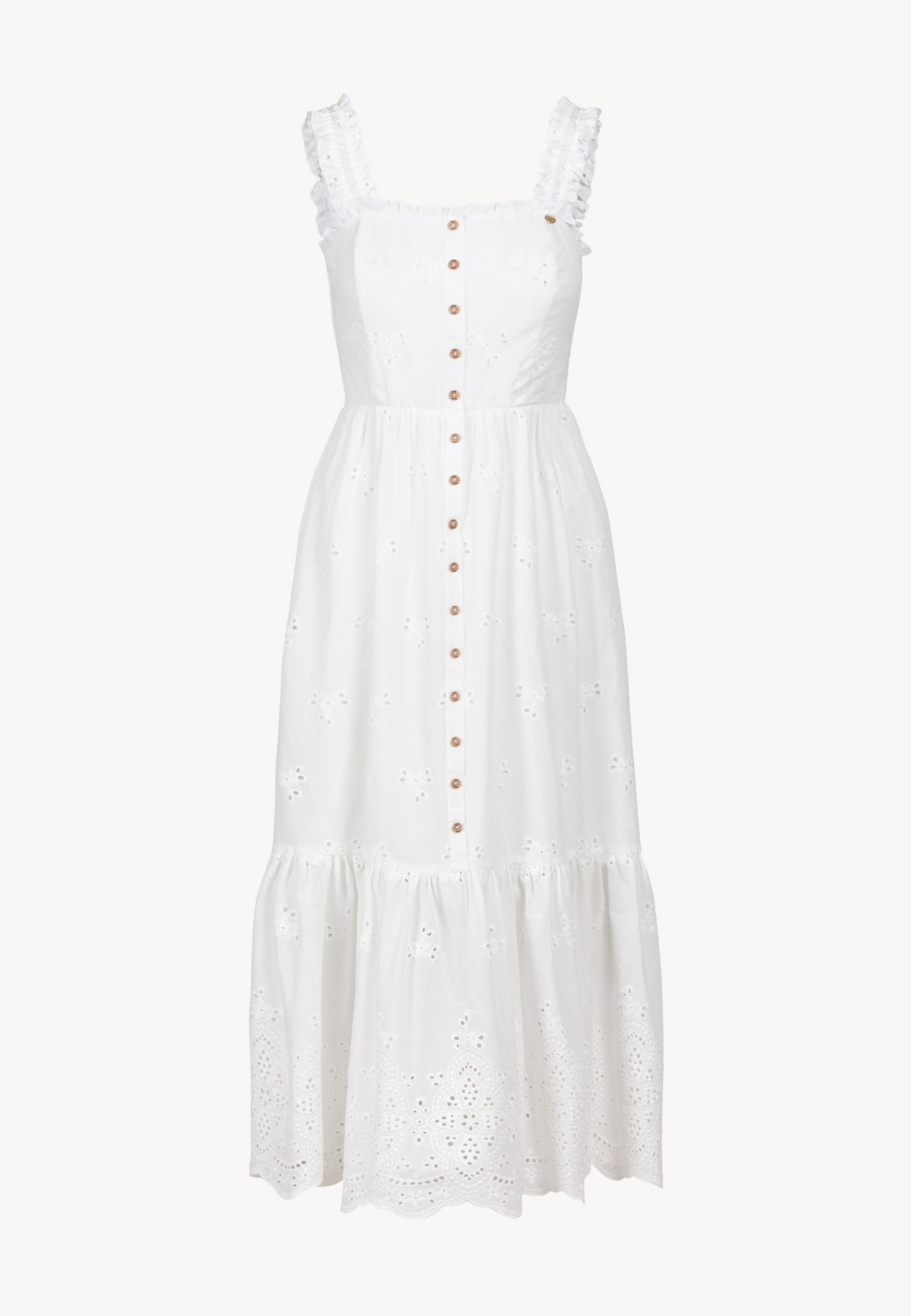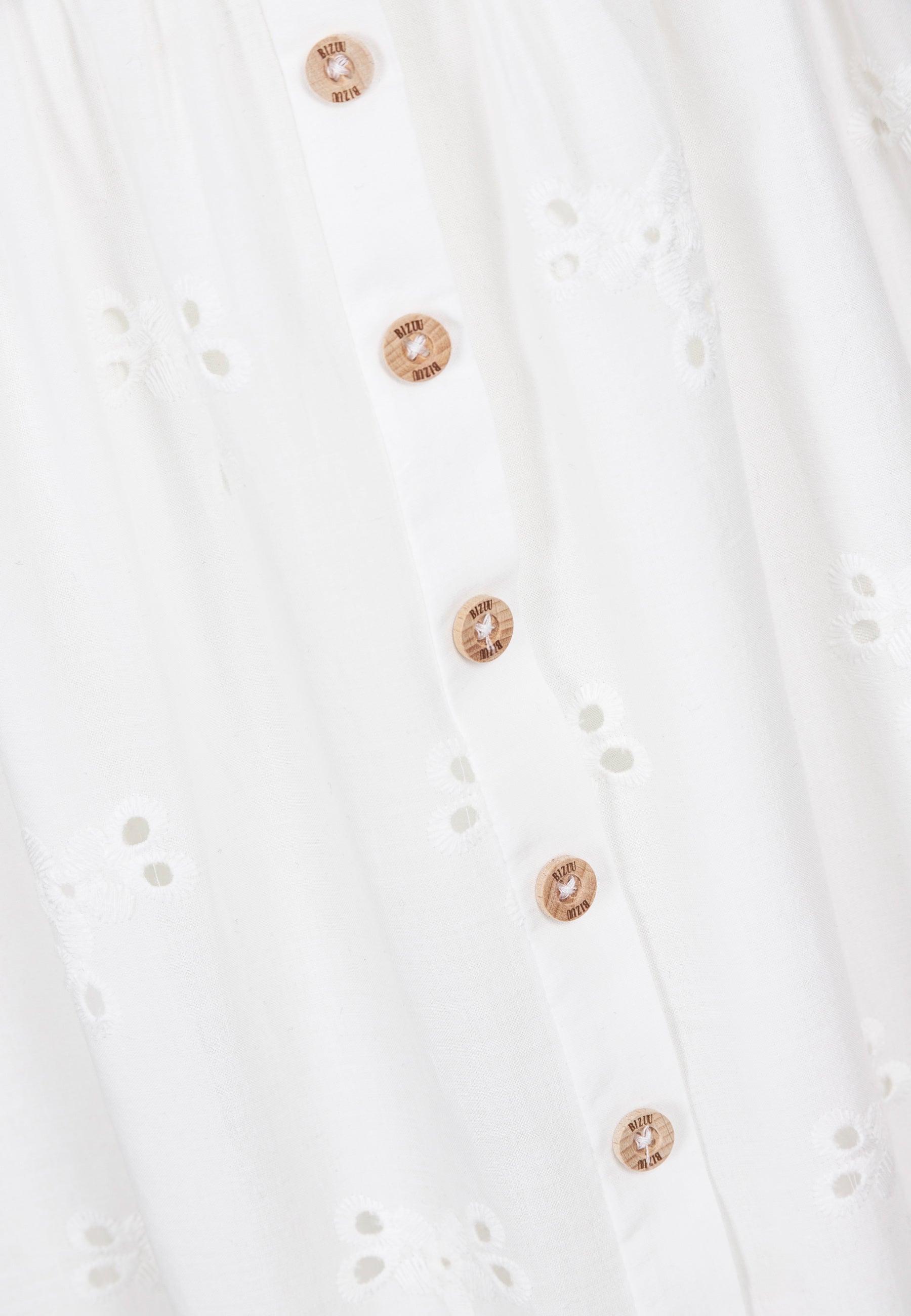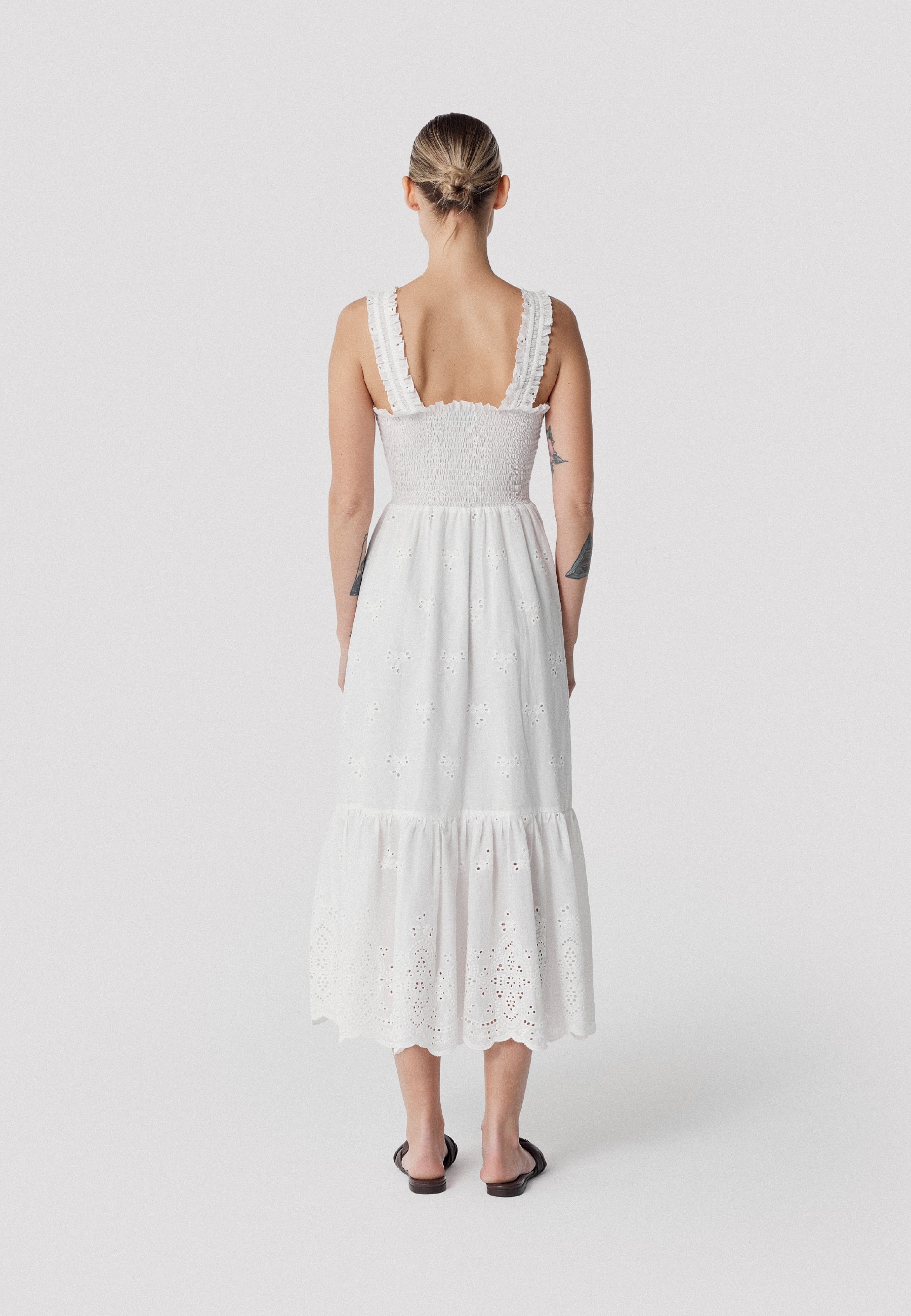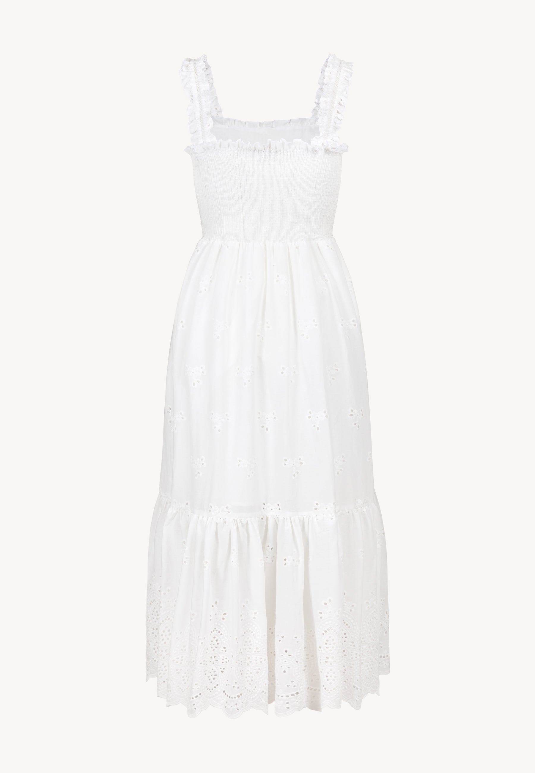 The BARCONNA strappy dress is made from high-quality cotton adorned with delicate English embroidery. This exceptional garment features a square neckline with a ruffle and a gold logo medallion. Wooden buttons that mimic a front closure and wide straps with elastic sewn through and finished with a ruffle emphasize its feminine character. A gathered waist ending in a wide ruffle with decorative embroidery creates an impressive flared bottom.